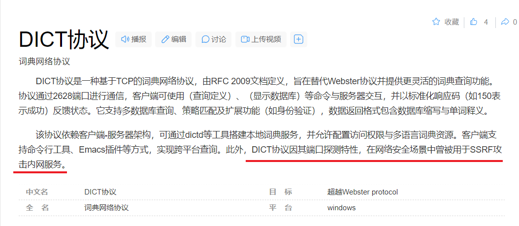 DICT协议因其端口探测特性,在网络安全场景中曾被用于SSRF攻击内网服务。