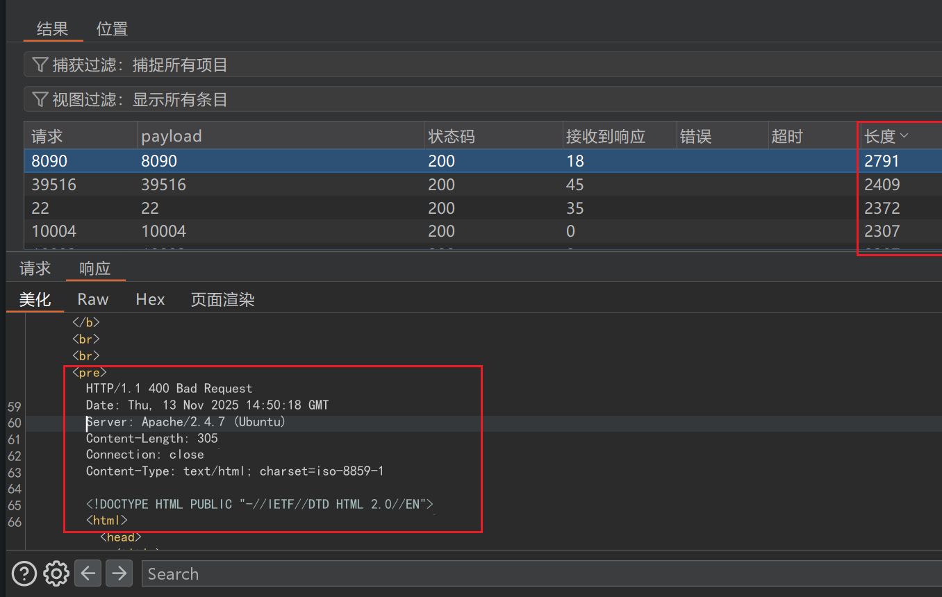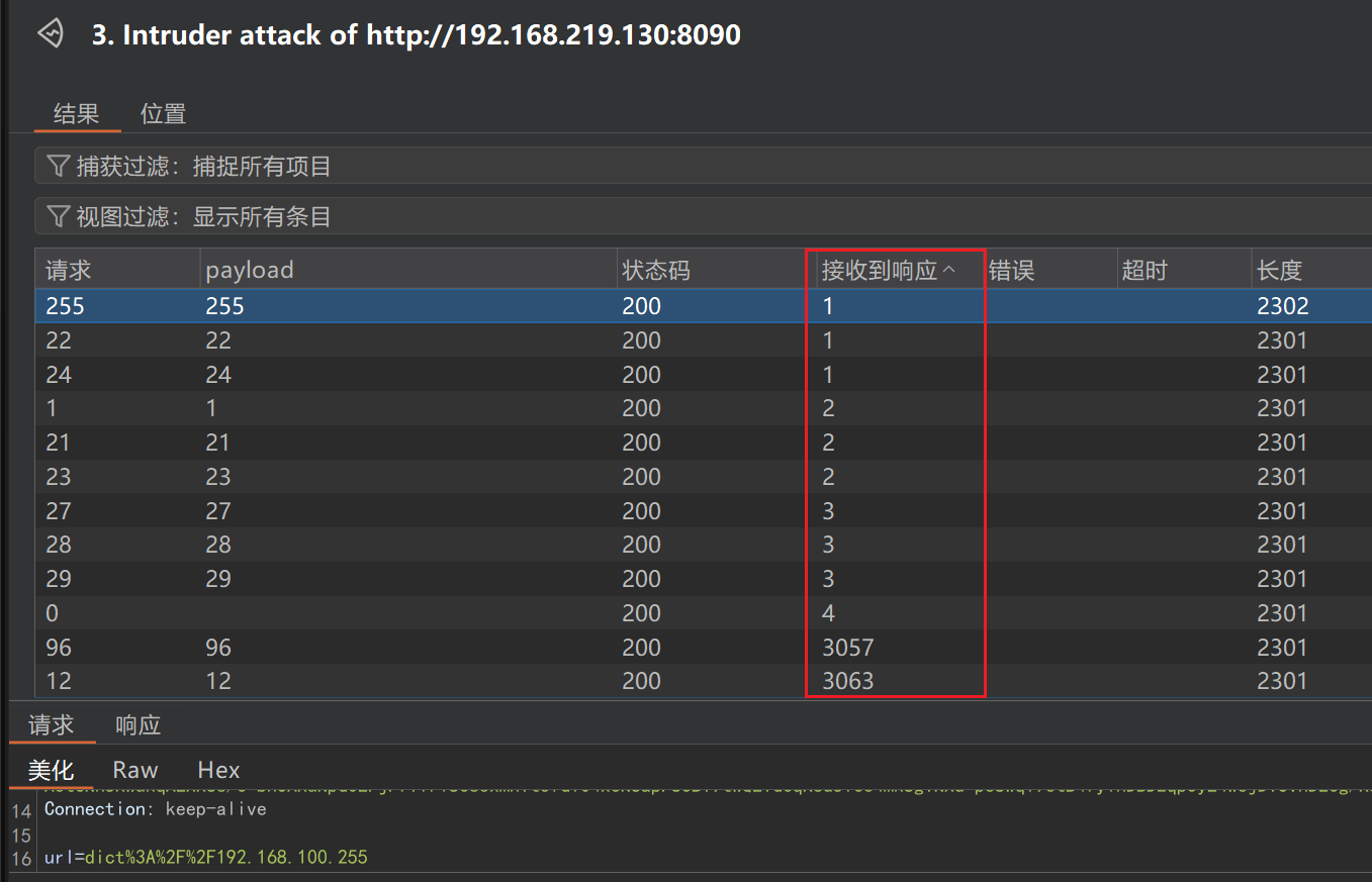 使用burp suite的intruder模块进行测试存活主机,通过接收到的响应一列的时间判断主机是否存活