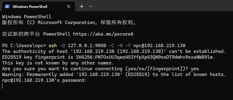 ssh -D 127.0.0.1:9050 -C -N -f npc@192.168.219.130