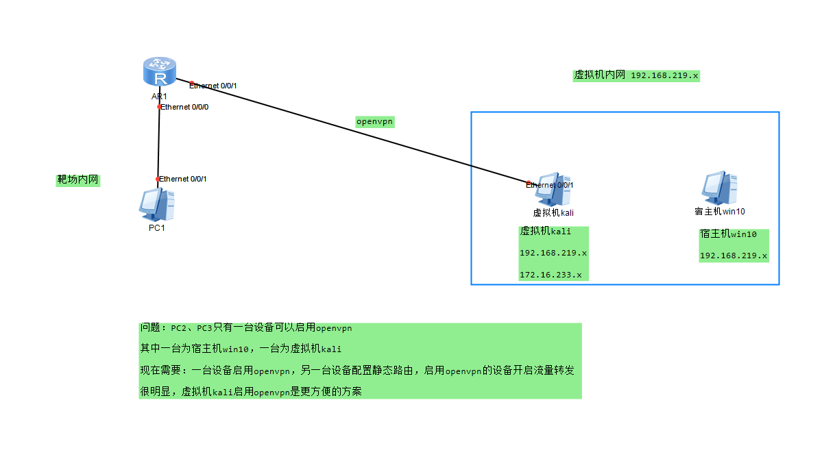 尝试在kali上启用openvpn,在给kali配置流量转发,在宿主机win10上配置一条静态路由,通过kali转发win10的流量到vpn内网