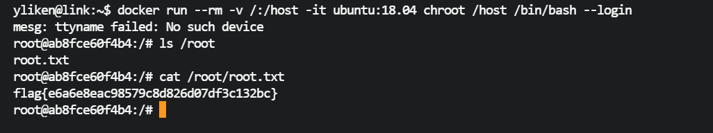 yliken@link:~$ docker run --rm -v /:/host -it ubuntu:18.04 chroot /host /bin/bash --login