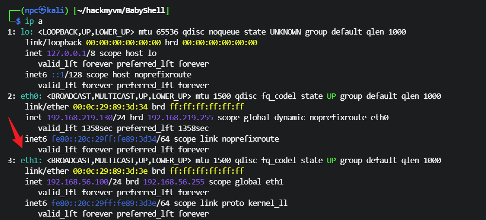 ip a命令找到靶机所在网段的网卡
