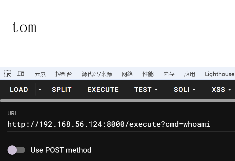 需要一个 cmd 参数,尝试 get 执行 whoami 命令,tom 用户在运行这个服务