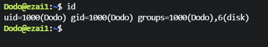 uid=1000(Dodo) gid=1000(Dodo) groups=1000(Dodo),6(disk)