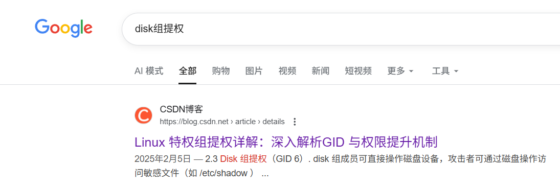 dodo用户属于disk组,不太常见,搜索有无 dist 组提权方式,找到一篇 用户组提权 的文章https://blog.csdn.net/2301_79518550/article/details/145452956