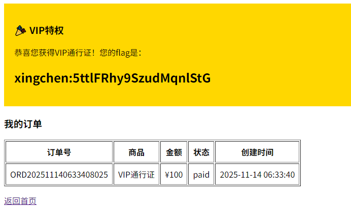 效果:账户被提升为 VIP,并回显凭据/flag: