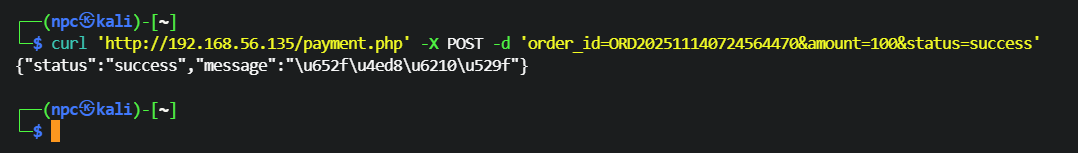 curl 'http://192.168.56.135/payment.php' -X POST -d 'order_id=ORD202511140724564470&amount=100&status=success'
