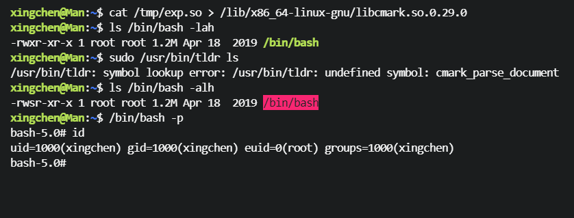 xingchen@Man:/tmp$ cat /tmp/exp.so > /lib/x86_64-linux-gnu/libcmark.so.0.29.0