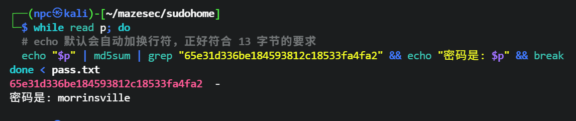 echo "$p" | md5sum | grep "65e31d336be184593812c18533fa4fa2" && echo "密码是: $p" && break