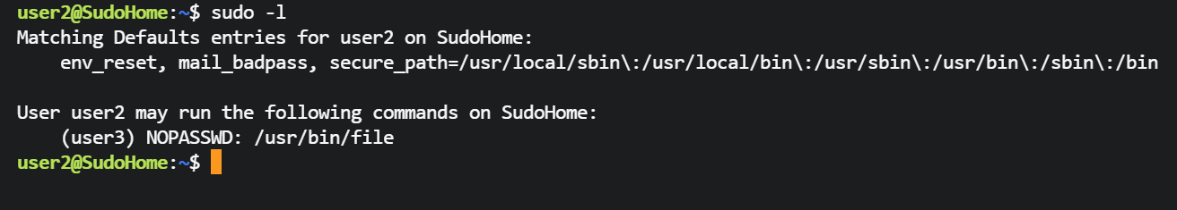 user2@SudoHome:~$ sudo -u user3 /usr/bin/file -f /home/user3/password.txt