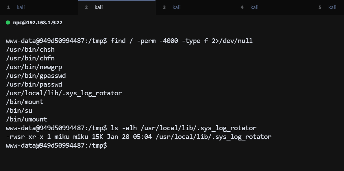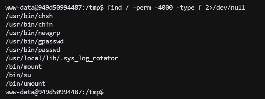 进入容器后,尝试寻找 suid 文件,发现异常文件 /usr/local/lib/.sys_log_rotator