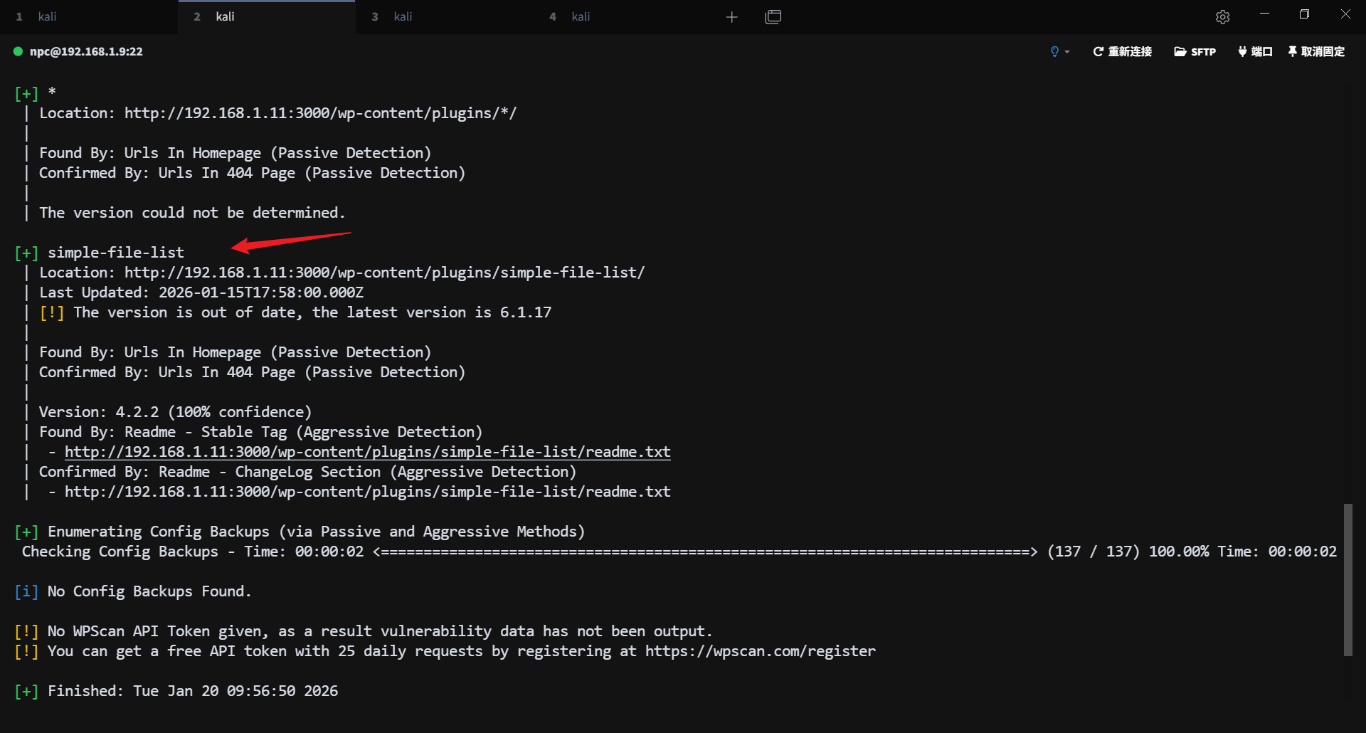 使用 wpscan 对 wordpress 进行扫描,发现存在一个可利用的插件漏洞 simple-file-list 4.2.2