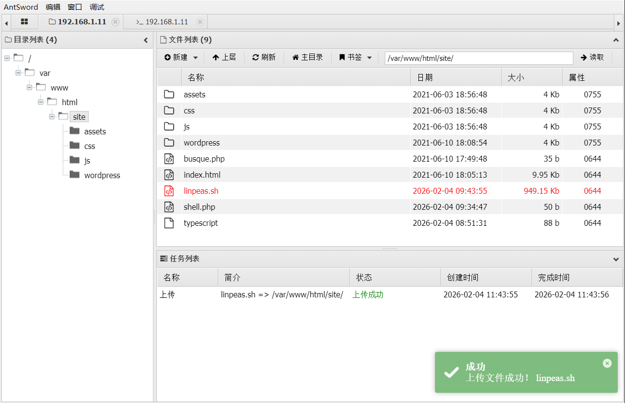 使用中国蚁剑连接 Webshell,并上传 linpeas.sh 进行提权辅助扫描。