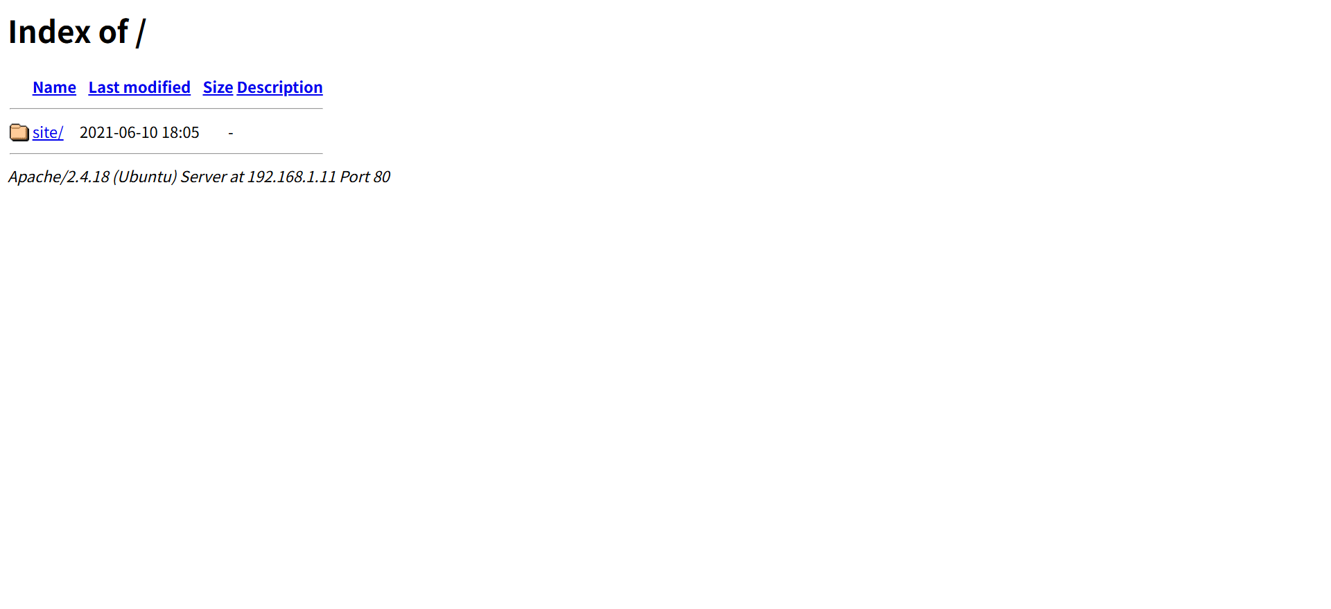 访问 80 端口,发现是一个 Apache 文件列表页面(Directory Listing)。目录下只有一个 site 目录。