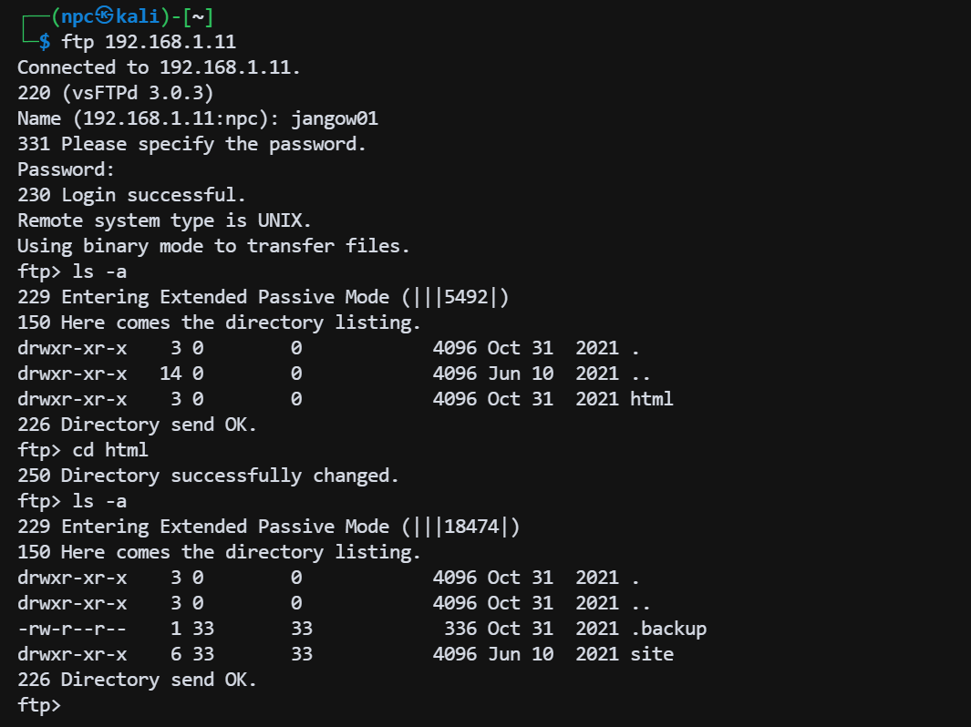 .backup备份文件,获取数据库凭证。 - 凭证复用:利用数据库密码登录 FTP,虽然无法写入 Shell,但利用 FTP 读取权限获取了现有的 Webshell 代码。