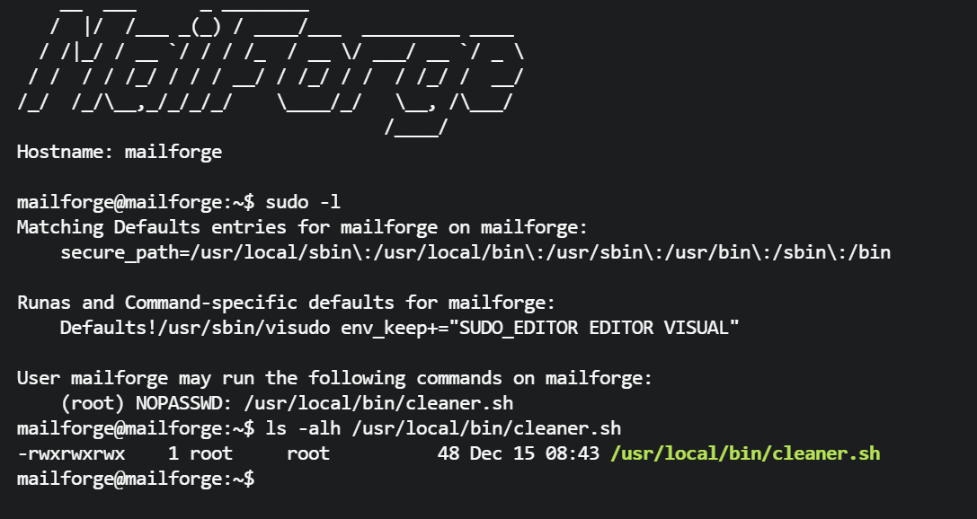 查看当前用户权限,可以 sudo 无密码执行 /usr/local/bin/cleaner.sh 脚本,并且这个脚本可写。