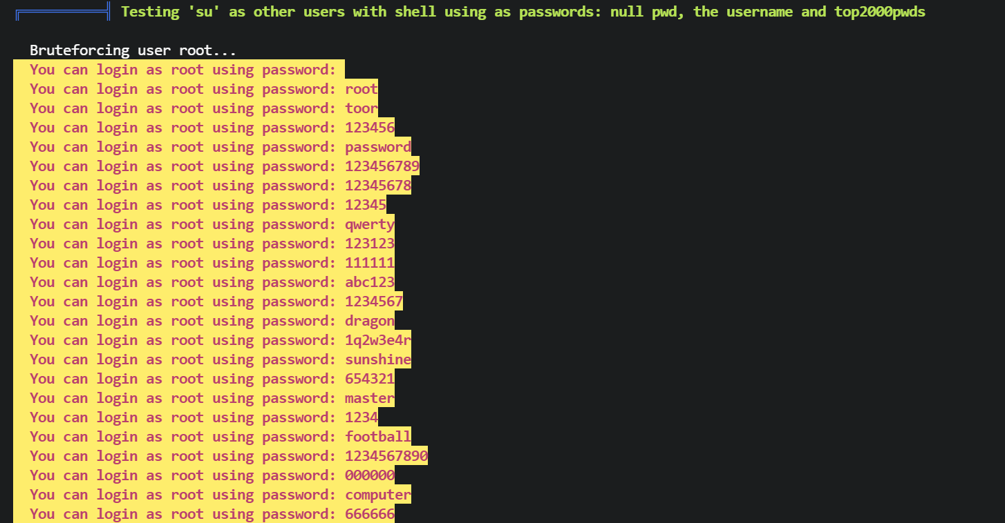 LinPEAS 报告显示几乎所有密码都能登录 root,这显然是误报。