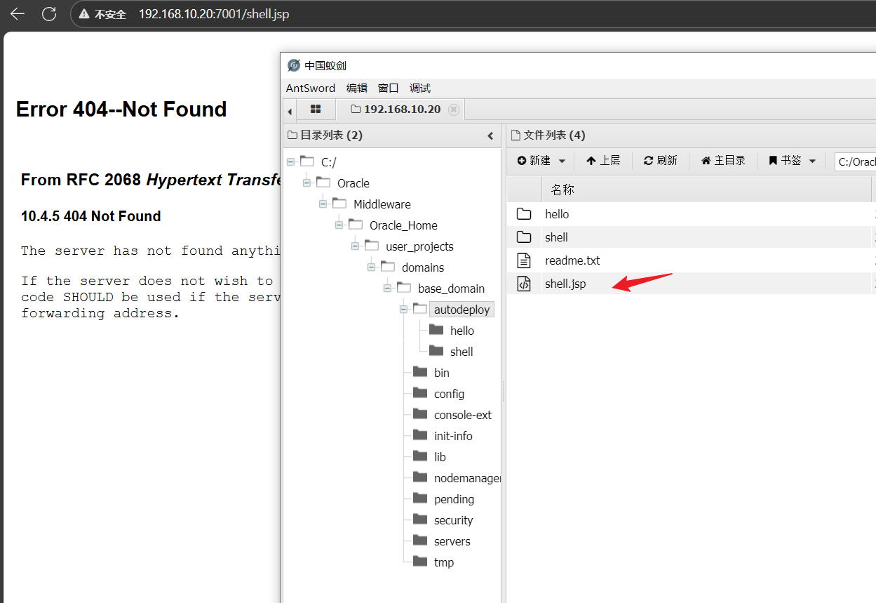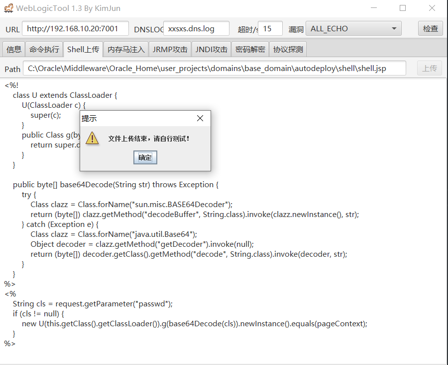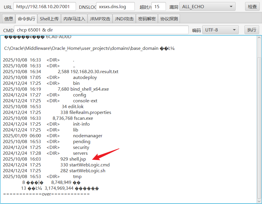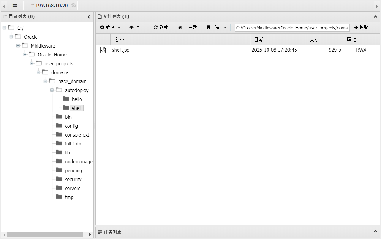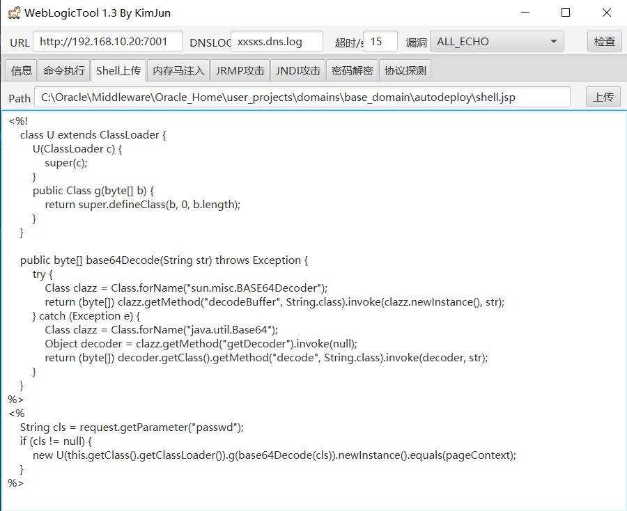 通过weblogic综合利用工具直接在命令执行的工作目录C:\Oracle\Middleware\Oracle_Home\user_projects\domains\base_domain上传webshell,不会解析