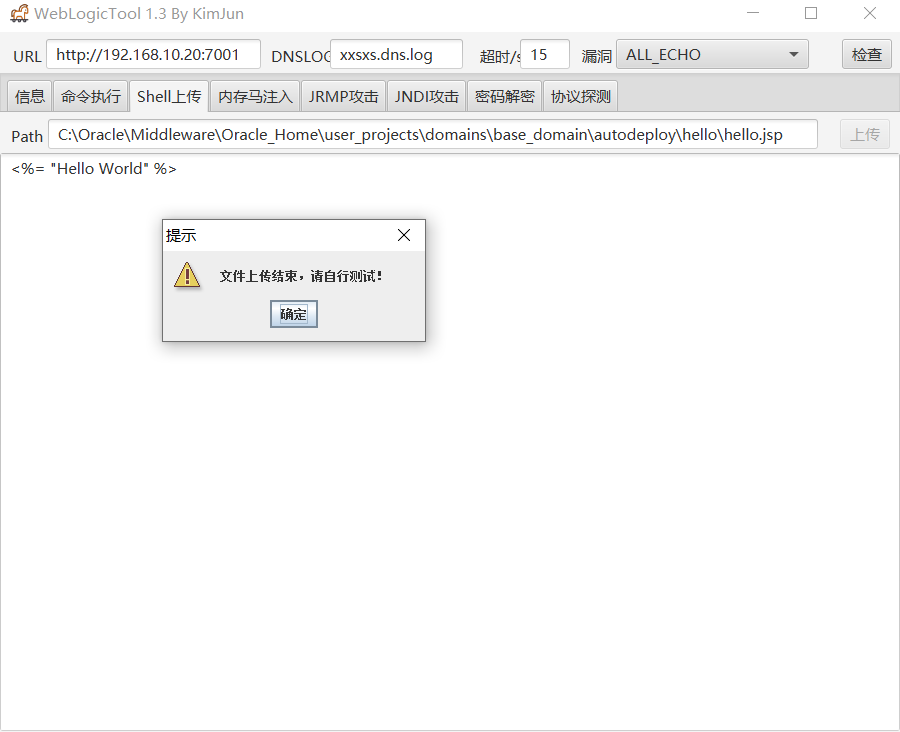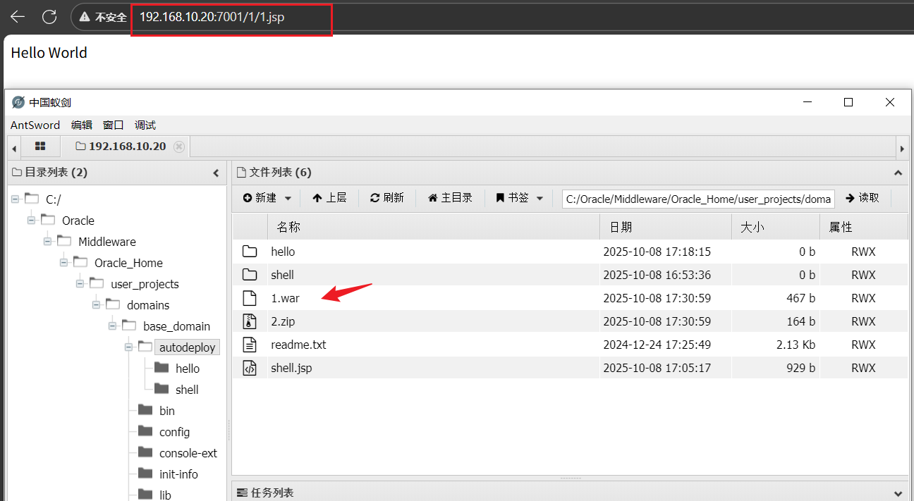 在绝对路径C:\Oracle\Middleware\Oracle_Home\user_projects\domains\base_domain\autodeploy\hello\hello.jsp写入简单jsp