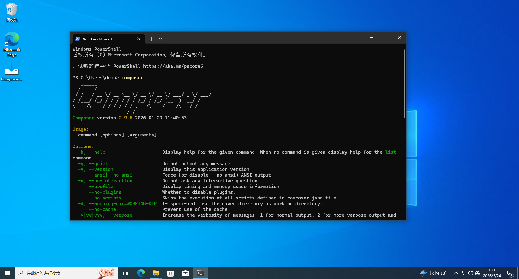 打开终端,输入 composer ,如果显示 composer 相关帮助信息,则说明安装成功。