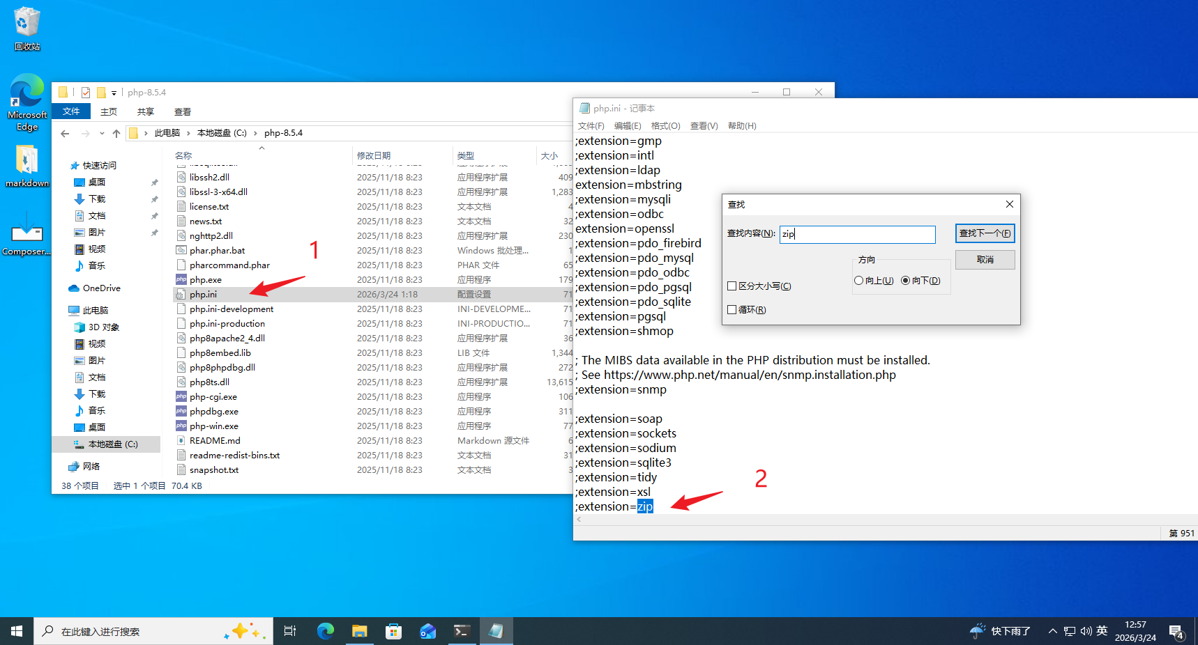 php 需要启用 zip 扩展,打开 php.ini 文件(在 php 解压目录下),找到 extension=zip,去掉前面的分号 ; 以启用该扩展,保存文件。