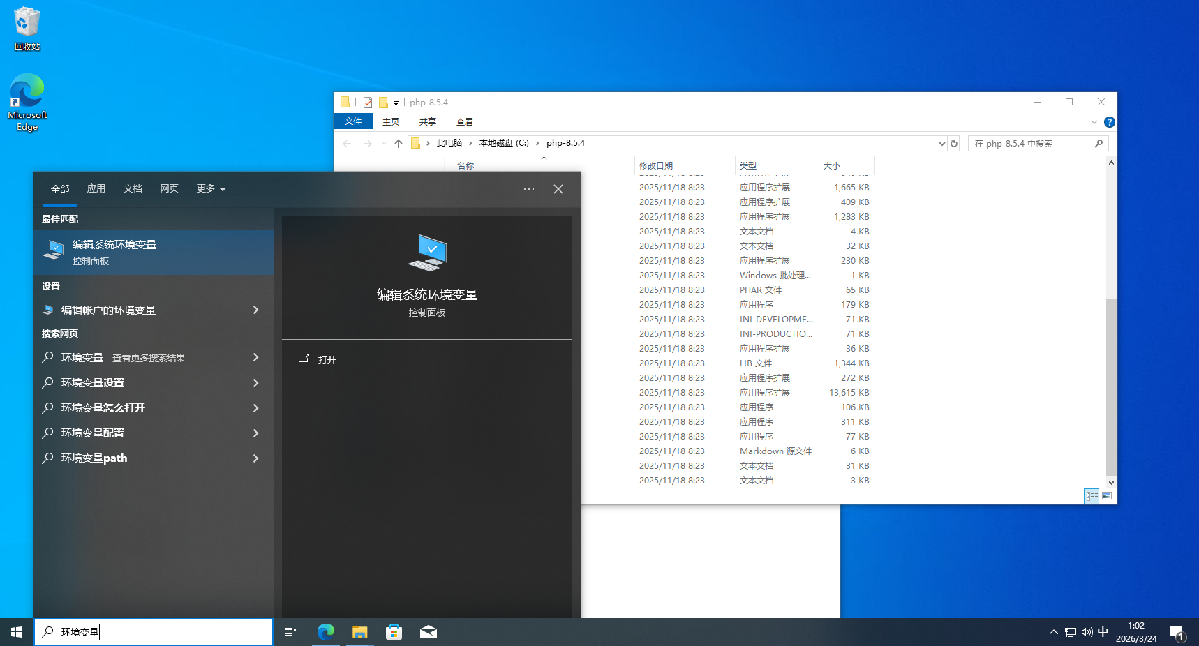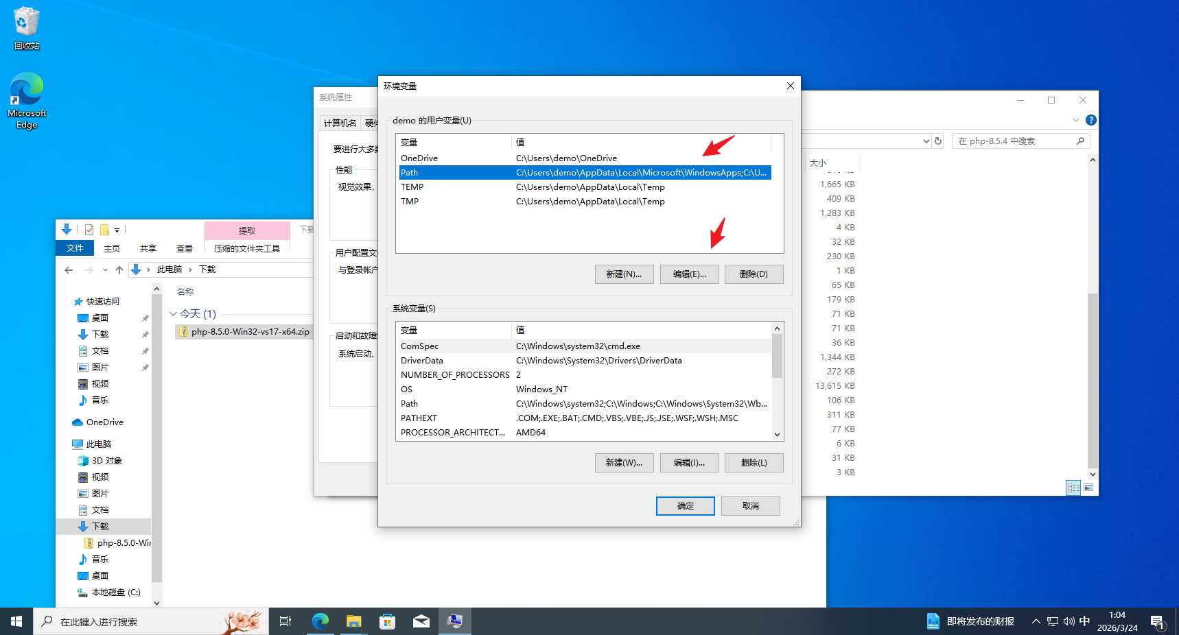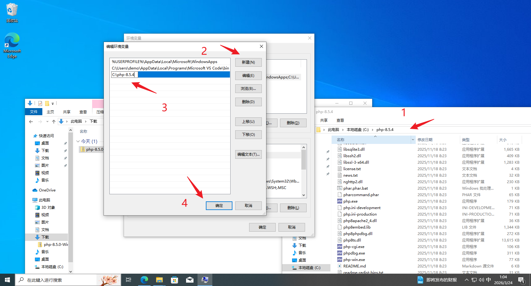 选中用户的 Path 变量,点击编辑,点击新建,输入 php 的解压目录,例如 C:\php-8.5.4\,点击确定保存。