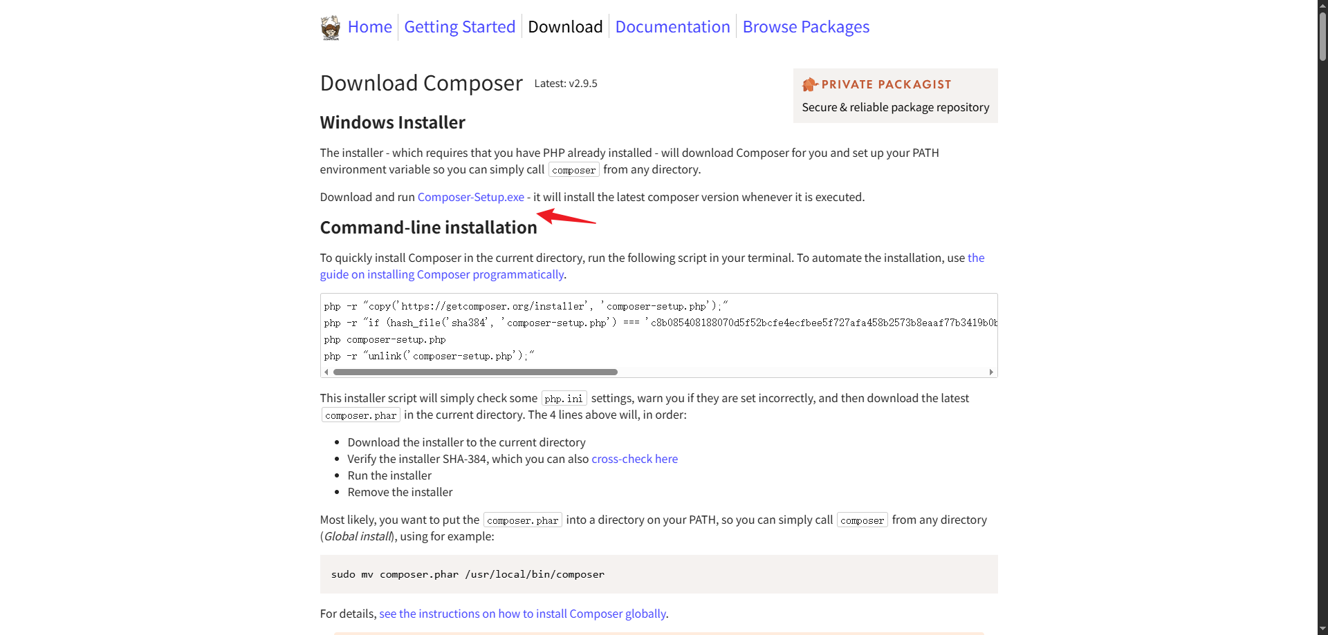 composer 安装过程会检测你的 PHP 环境,如果之前的环境变量配置正确,安装程序会自动找到 PHP 可执行文件。
